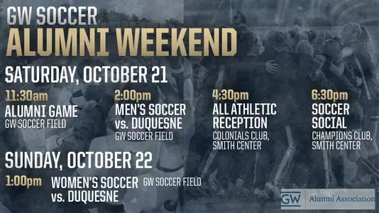 WASHINGTON - George Washington men's and women's soccer will celebrate Alumni Weekend on Oct. 21 and 22.