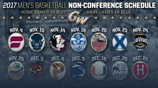 WASHINGTON -- Home contests with Miami, Princeton, and Harvard, along with the BB&T Classic vs. Temple and away from home clashes against the likes of Florida State and Xavier highlight the GW men's basketball team's 2017-18 non-conference slate, which was announced Wednesday.