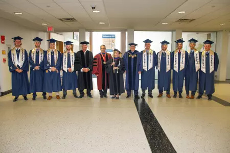The ceremony began with a processional into the theater led by University Marshal Sylvia Marotta-Walters, Provost and Executive Vice President for Academic Affairs Forrest Maltzman, head coach Gregg Ritchie and President LeBlanc.